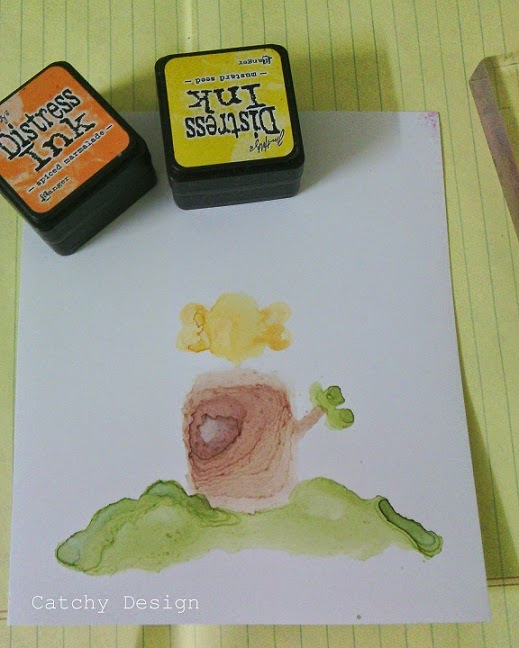 Like wise, I did same for the grass, the chicken and the balloon. It's a very easy technique with loads of fun. Once all dry, took a dry paint brush with the respective inks and I gave some details for the well-defined look!